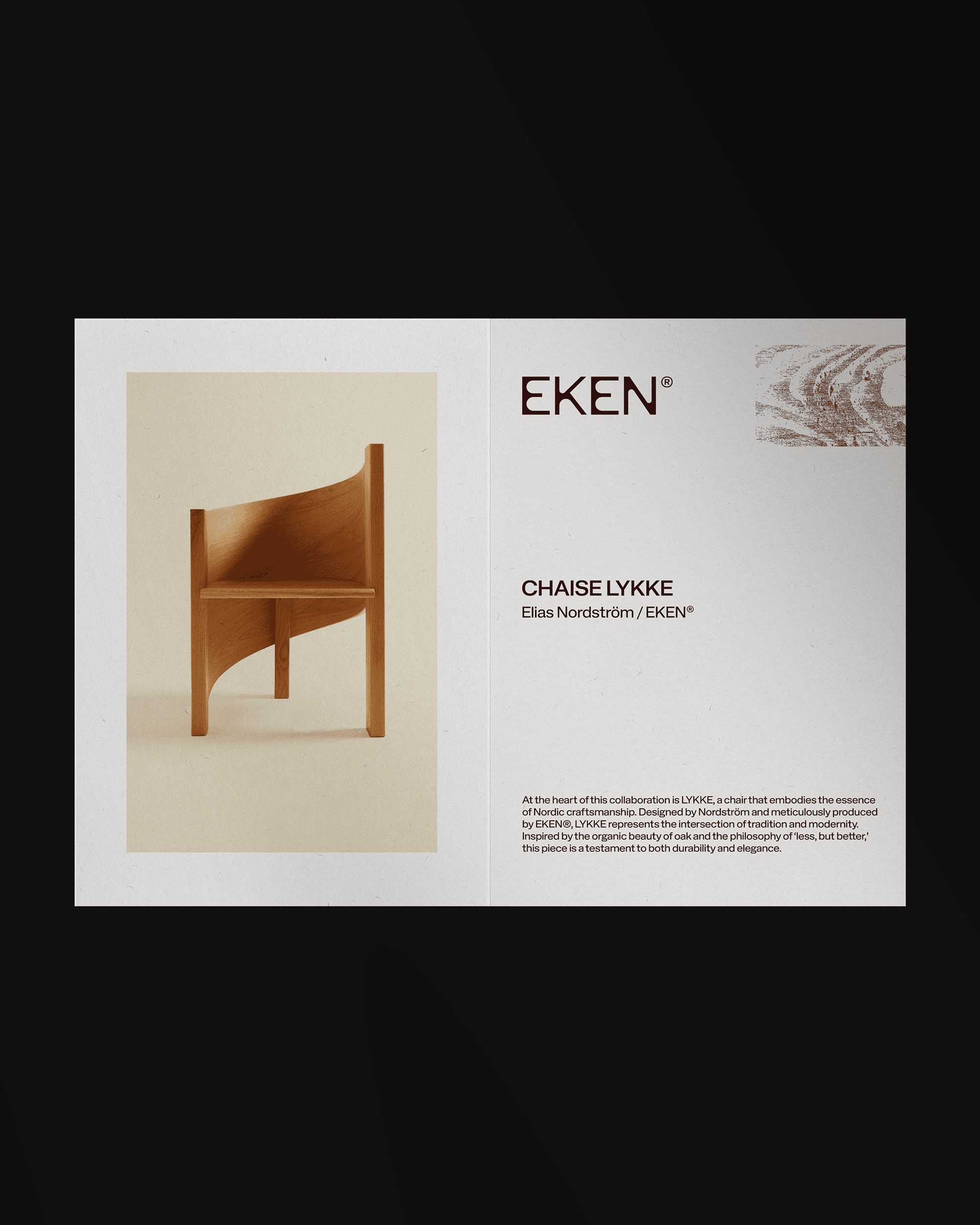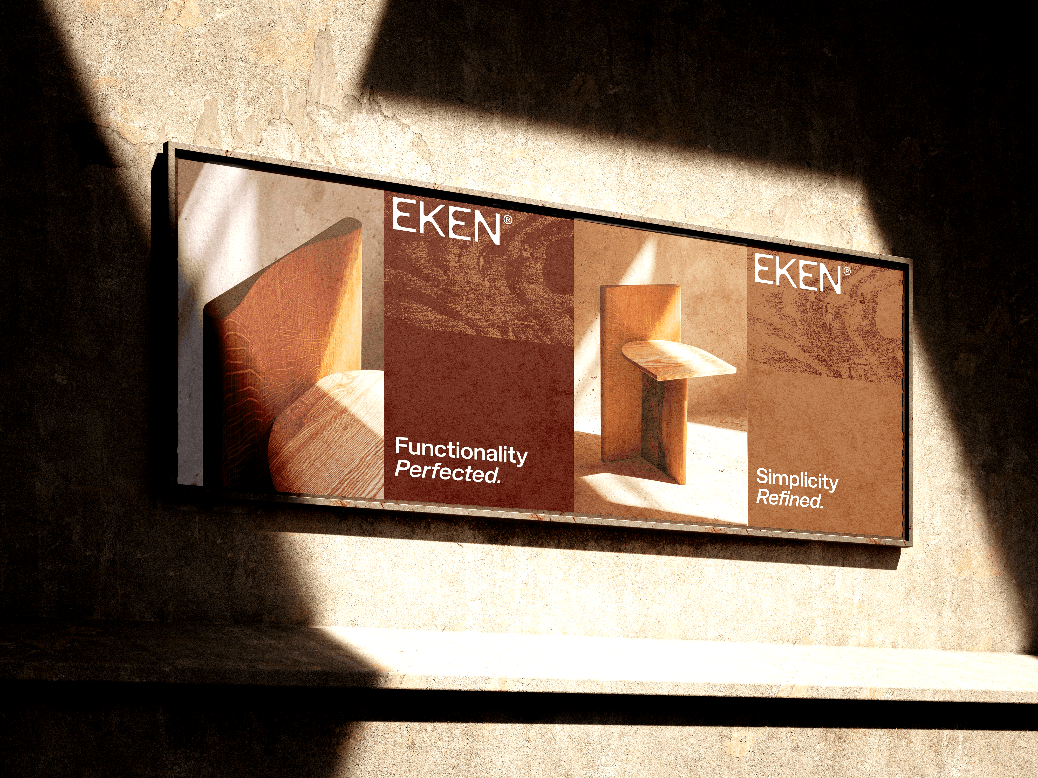 EKEN® est une identité visuelle conçue pour une marque de mobilier premium à travers une approche à la fois contemporaine, structurée et raffinée. Le projet s’articule autour d’une typographie sur mesure inspirée des courbes et des éléments d’assemblage propres au design mobilier, afin de traduire une présence forte, précise et discrète à la fois.
